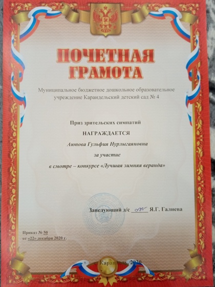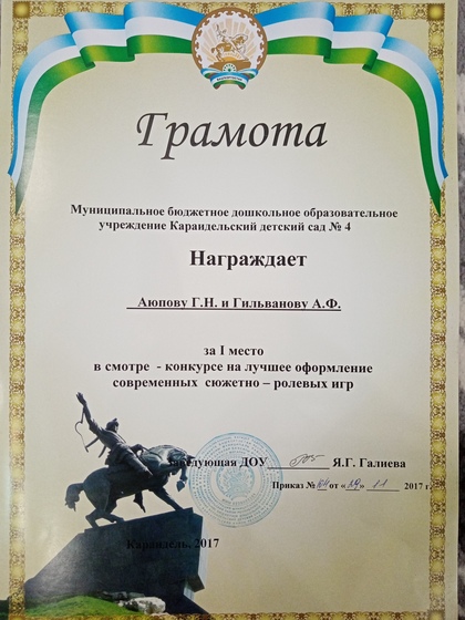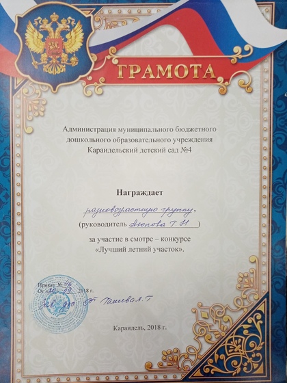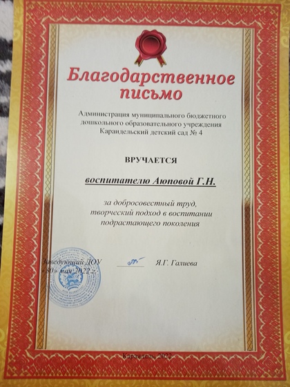 - Благодарственное письмо. Администрация муниципального бюджетного дошкольного образовательного учреждения Караидельский детский сад №4