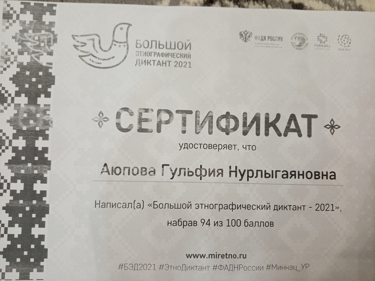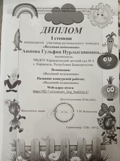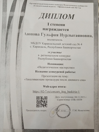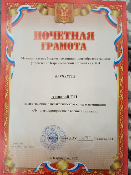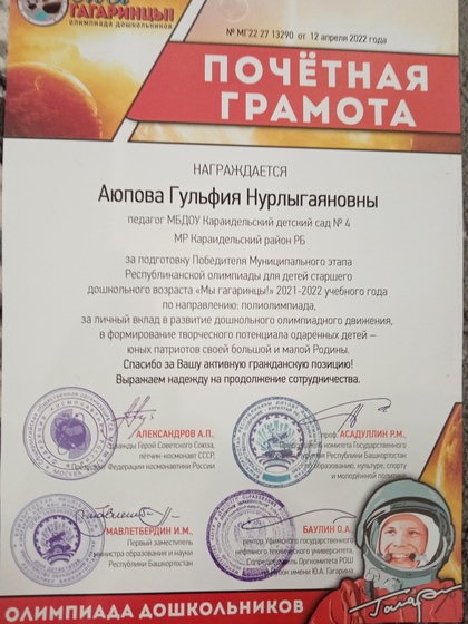 - Почетная грамота. «Олимпиада «Мы гагаринцы!» за подготовку лауреата республиканского этапа Республиканской олимпиады для детей старшего дошкольного возраста «Мы гагаринцы!» 2021-2022 учебный год по направлению: полиолимпиада