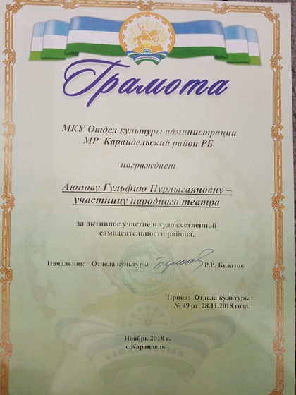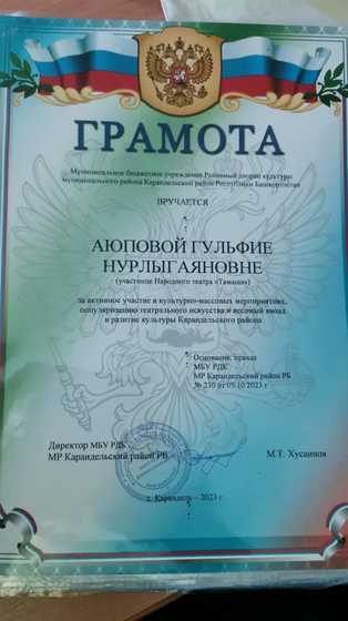 - Грамота. Муниципальное бюджетное учреждение Районный дворец культуры муниципального района Караидельский район РБ за активное участие в культурно – массовых мероприятиях, популяризацию театрального искусства и весомый вклад в развитие культуры Караидельского района, 2023г.;