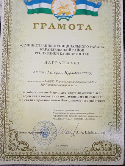 - Грамота. Администрации муниципального района Караидельский район Республики Башкортостан за добросовестный труд, достигнутые успехи в деле обучения и воспитания подрастающего поколения и связи с празднованием Дня дошкольного работника, 2022 г.;