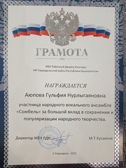 - МБУ Районный Дворец Культуры МР Караидельский район РБ за большой вклад в сохранении и популяризации народного творчества, 2022.;