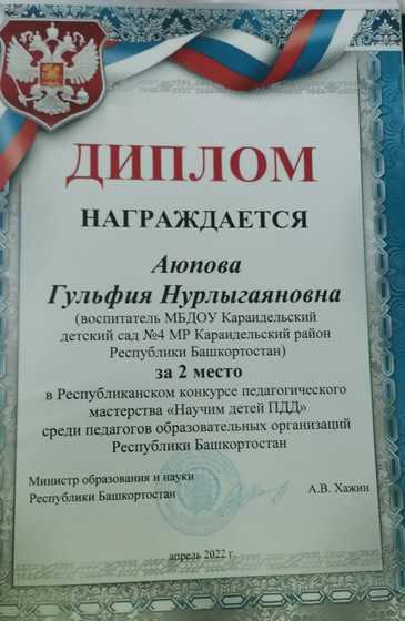 - Диплом. Республиканский конкурс педагогического мастерства «Научим детей ПДД», 2022 г.;